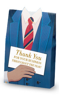 It’s great if the gift is something that will sit on the recipient’s desk and create conversation about your company. The Business Suit Box (pictured) can be filled with nuts, cookies or chocolates and some of your business cards (to make it easy for them to refer you).